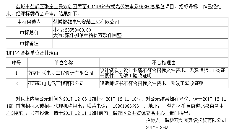 鹽城市鹽都區(qū)張莊全民雙創(chuàng)園屋面4.11MW分布式光伏發(fā)電系統(tǒng)EPC總承包結(jié)果公示