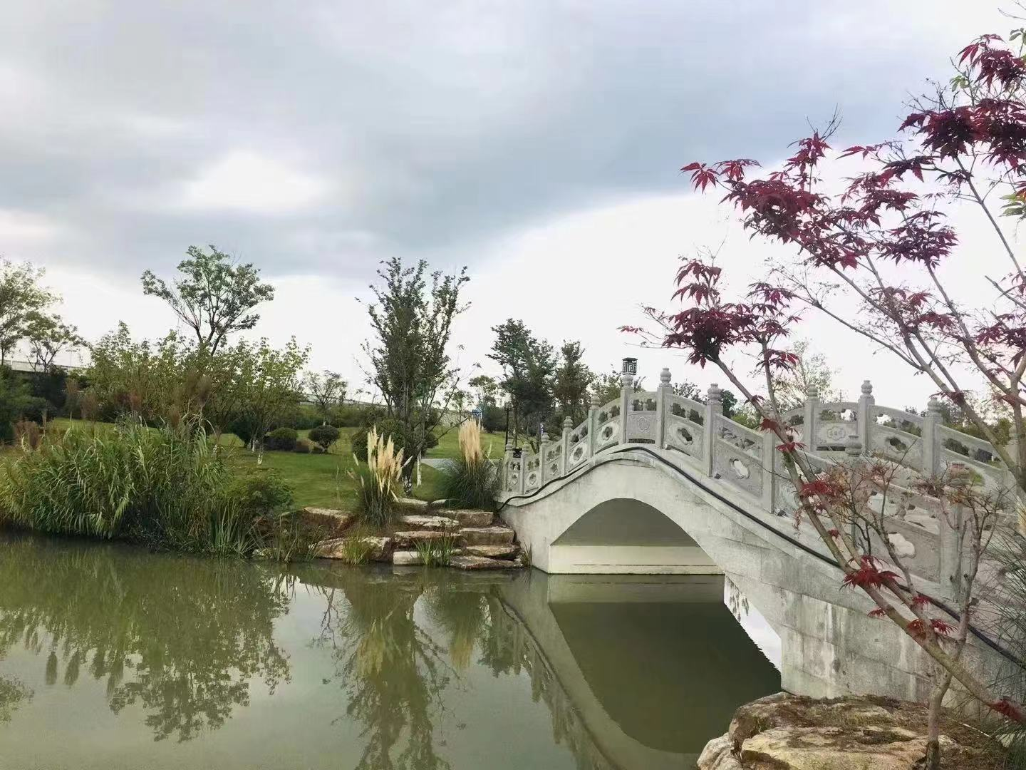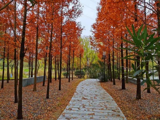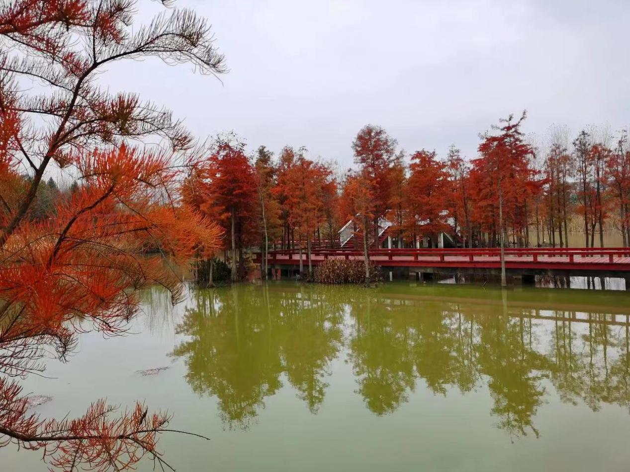 紅葉襯著綠樹,小橋伴著流水,既有曲徑通幽之妙,也有寬闊草地之美。公園集生態(tài)休閑、觀光旅游等功能為一體,游客可以在公園內(nèi)擁有濕地旅游、白果采摘、戶外燒烤等豐富多樣的出游體驗(yàn)。