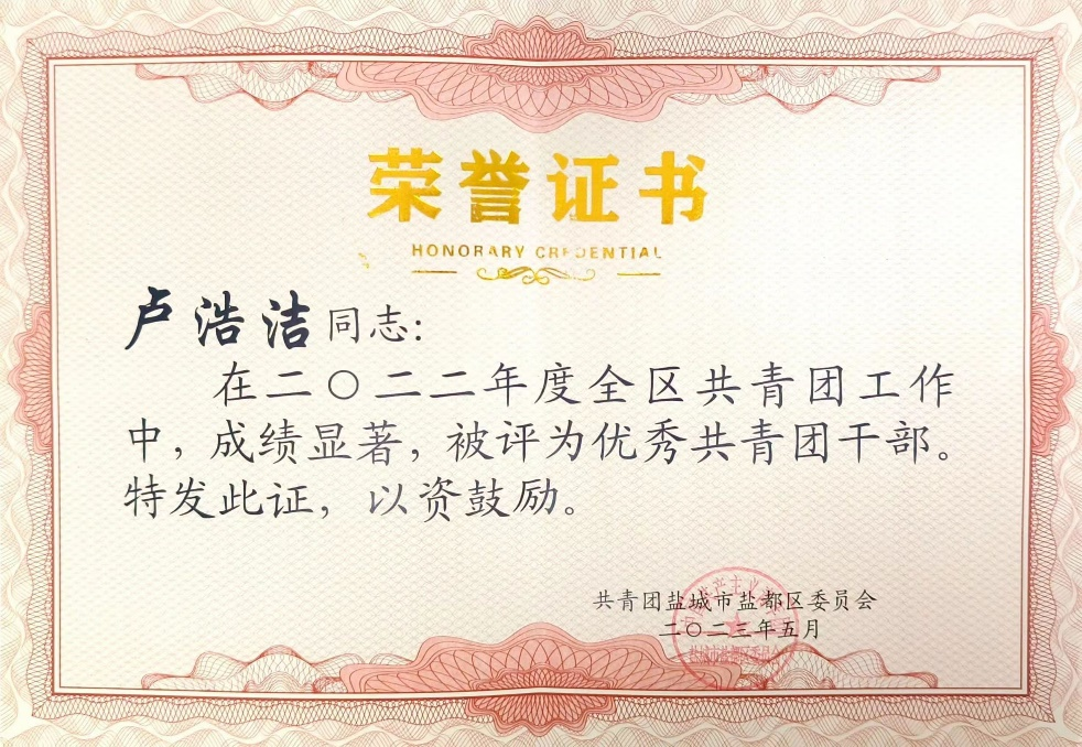 近日,“鹽都區(qū)新長征突擊手”“鹽都區(qū)優(yōu)秀共青團(tuán)干部”等獎項(xiàng)的評選結(jié)果揭曉,集團(tuán)團(tuán)委書記盧浩潔榮獲“鹽都區(qū)優(yōu)秀共青團(tuán)干部”稱號。