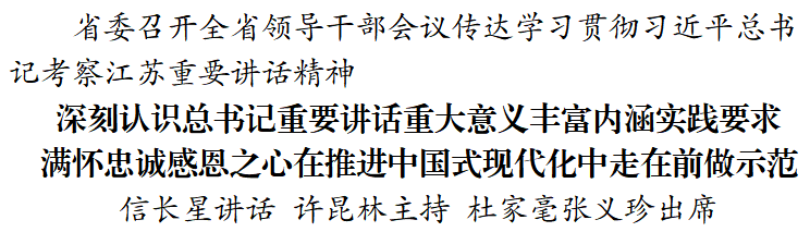 信長(zhǎng)星在講話中說,江蘇一直是習(xí)近平總書記的關(guān)注點(diǎn)、調(diào)研點(diǎn)和研究點(diǎn),總書記對(duì)江蘇的關(guān)注始終是進(jìn)行時(shí)。黨的十八大以來,習(xí)近平總書記多次親臨江蘇考察指導(dǎo),發(fā)表一系列重要講話、作出一系列重要指示,為江蘇發(fā)展精準(zhǔn)把脈、擘畫藍(lán)圖。當(dāng)前,中華民族偉大復(fù)興正在育新機(jī)、開新局,全面建設(shè)社會(huì)主義現(xiàn)代化國(guó)家處在開局起步的關(guān)鍵階段。習(xí)近平總書記再次深入江蘇考察,時(shí)隔4個(gè)月對(duì)江蘇工作作出新的重要指示,飽含著對(duì)江蘇人民的深情厚愛和巨大關(guān)懷,充分體現(xiàn)了對(duì)江蘇發(fā)展一以貫之的殷切期望和信任重托。這次考察,總書記著眼強(qiáng)國(guó)建設(shè)、民族復(fù)興,聚焦中國(guó)式現(xiàn)代化的重點(diǎn)領(lǐng)域提出一系列新思想新觀點(diǎn)新論斷,明確指出江蘇有能力也有責(zé)任在推進(jìn)中國(guó)式現(xiàn)代化中走在前、做示范,賦予我們?cè)诳萍紕?chuàng)新上取得新突破、在強(qiáng)鏈補(bǔ)鏈延鏈上展現(xiàn)新作為、在建設(shè)中華民族現(xiàn)代文明上探索新經(jīng)驗(yàn)、在推進(jìn)社會(huì)治理現(xiàn)代化上實(shí)現(xiàn)新提升的“四個(gè)新”重大任務(wù),并對(duì)“以學(xué)促干”作出深刻闡釋,給全省上下以極強(qiáng)的思想指引、精神鼓舞、奮斗感召,為新征程上江蘇應(yīng)該干什么、怎樣干得更好進(jìn)一步指明了前進(jìn)方向、提供了行動(dòng)指南、明確了目標(biāo)路徑。我們要滿懷忠誠(chéng)感恩之心,自覺從堅(jiān)定擁護(hù)“兩個(gè)確立”、堅(jiān)決做到“兩個(gè)維護(hù)”的高度,深入學(xué)習(xí)領(lǐng)會(huì)總書記重要講話精神,深刻把握蘊(yùn)含其中的重大政治意義、理論意義和實(shí)踐意義,胸懷“兩個(gè)大局”,牢記“國(guó)之大者”,把握“強(qiáng)省之要”,堅(jiān)定不移沿著總書記指引的方向勇毅前行,以當(dāng)表率、做示范、走在前的果敢擔(dān)當(dāng),奮力推進(jìn)中國(guó)式現(xiàn)代化江蘇新實(shí)踐,譜寫“強(qiáng)富美高”新江蘇現(xiàn)代化建設(shè)新篇章。